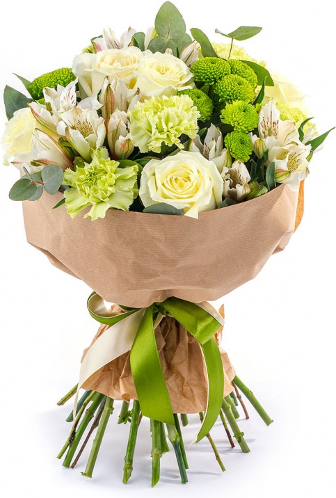 1 белая роза, 1 альстромерия, 1 зеленая хризантема, 1 гвоздика, эвкалипт, упаковка, лента2 белых розы, 2 альстромерии, 2 зеленых хризантем, 2 гвоздики, эвкалипт, упаковка, лента5 белых роз, 3 альстромерии, 3 зеленых хризантем, 3 гвоздики, эвкалипт, упаковка, лента